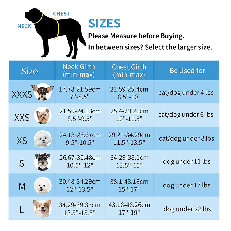 - Note: Do not rely solely on weight for sizing—always measure your pet's chest and neck to ensure the perfect fit. Refer to our sizing chart for guidance, and if between sizes, choose the larger one for added comfort.