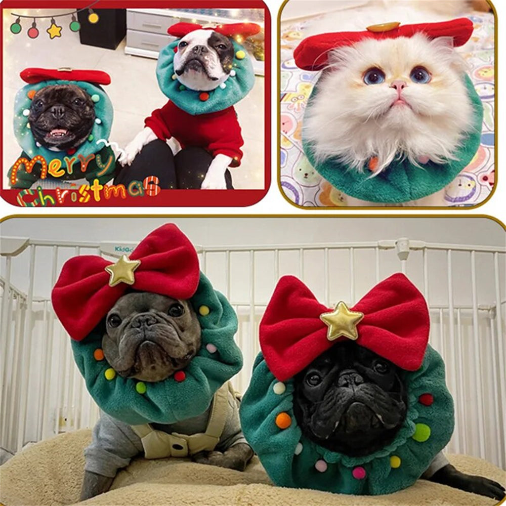 - Festival color and patterns: Designed with big red bow with star on the head and coloful pom-pom surrounded on the gree collar, the pet collar is elastic, fit perfectly for the pet size, easy to take on and off, adding pleasing and happy atmosphere.